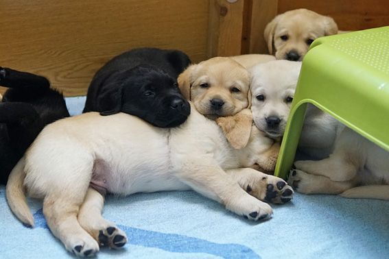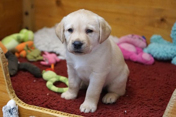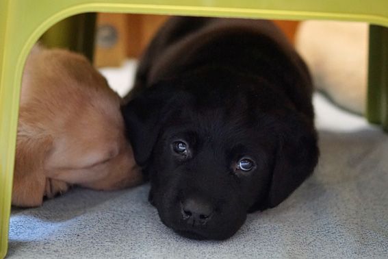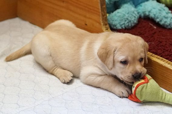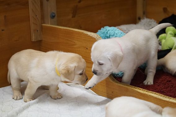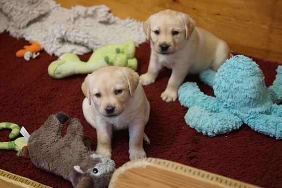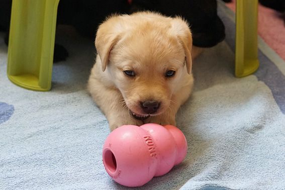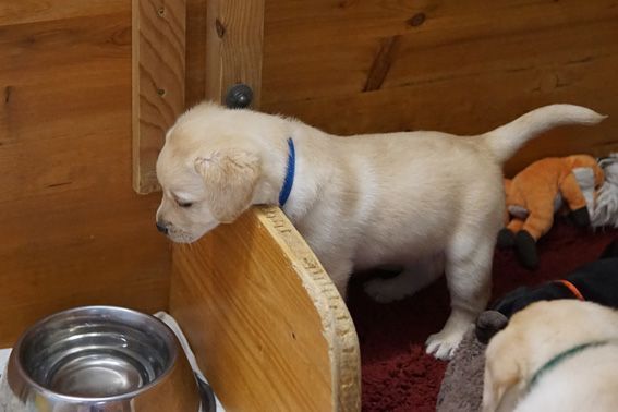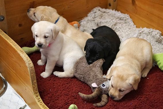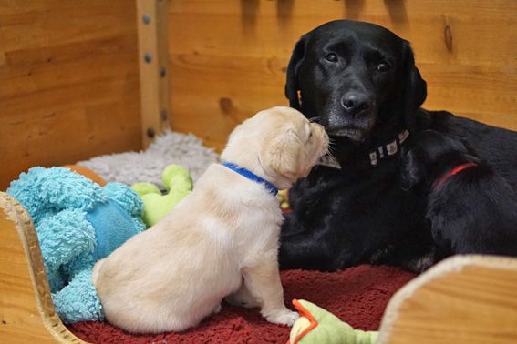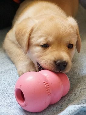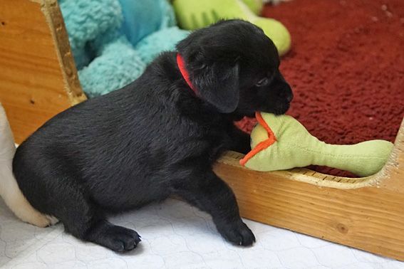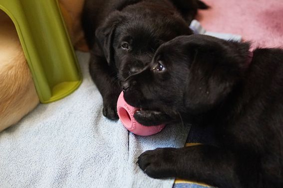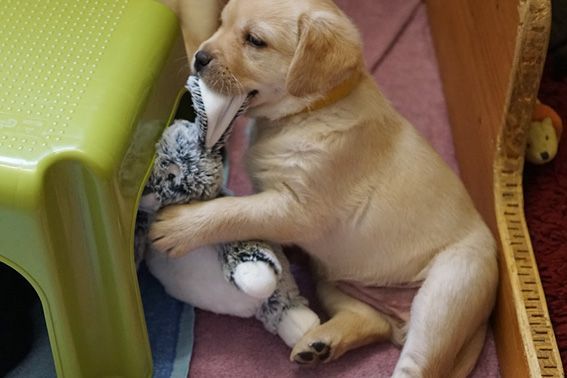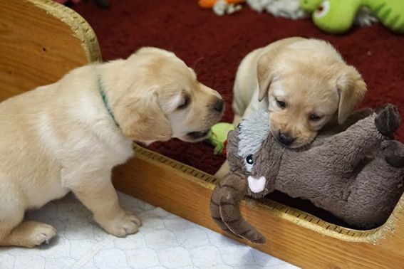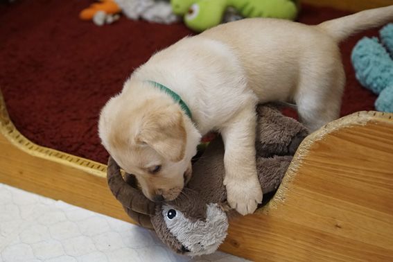 Wir spielen und balgen uns. Wir tragen die Spielsachen und interessieren uns für alles