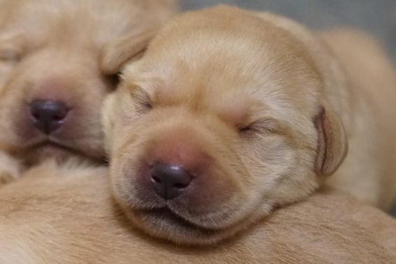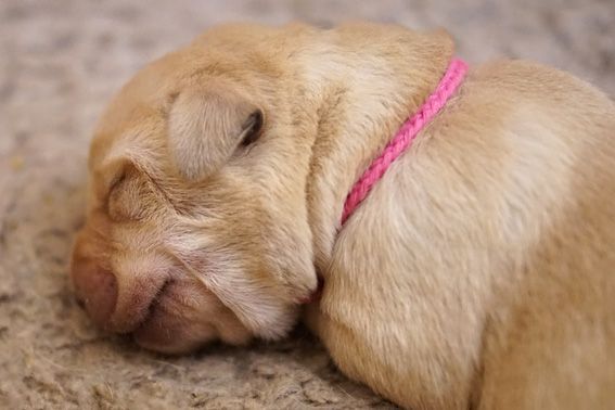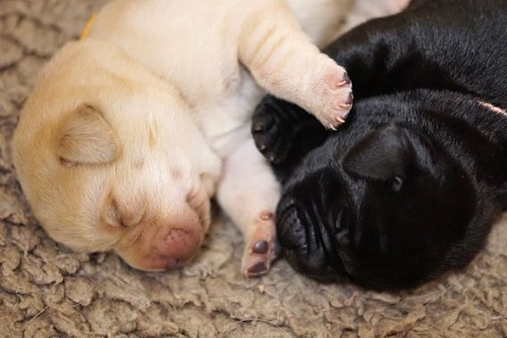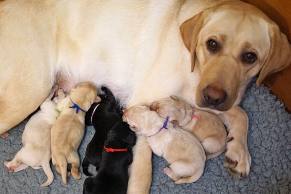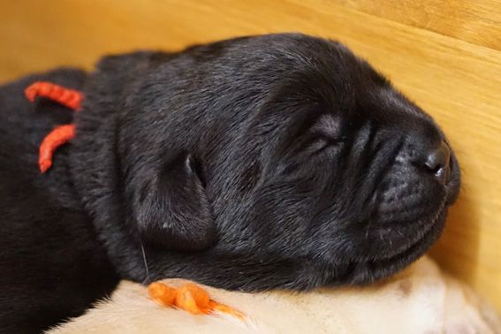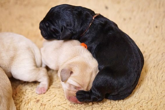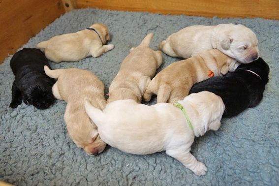 Es sind 1 Rüde schwarz und 5 Rüden gelb, 1 Hündin schwarz und 2 Hündinnen gelb.