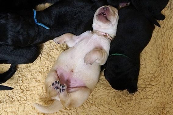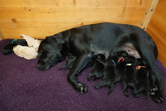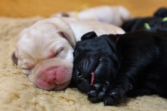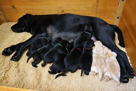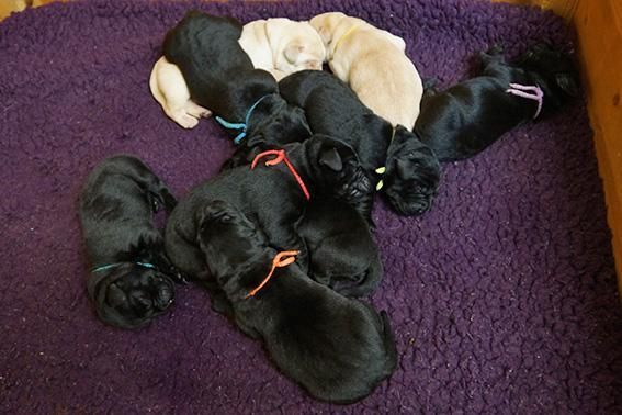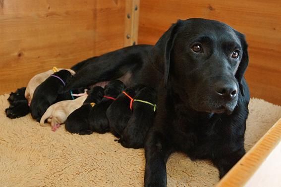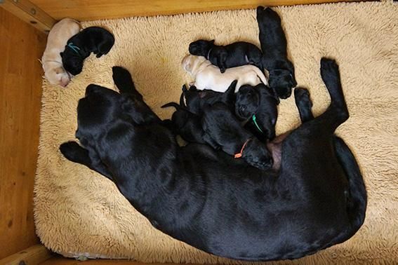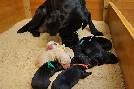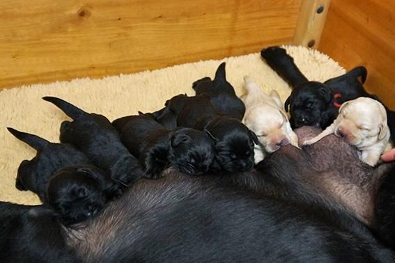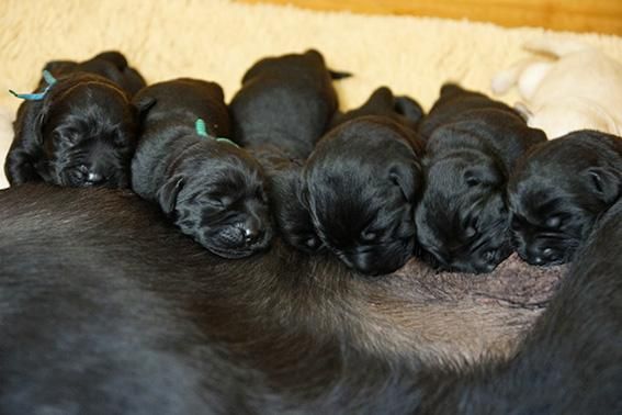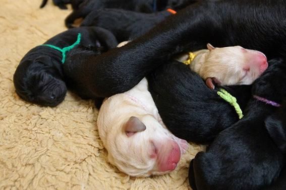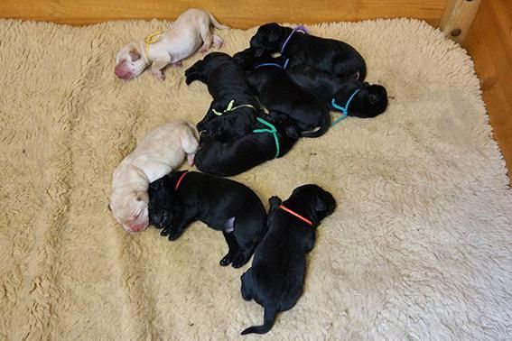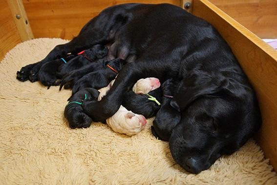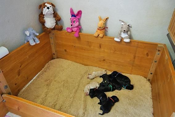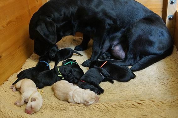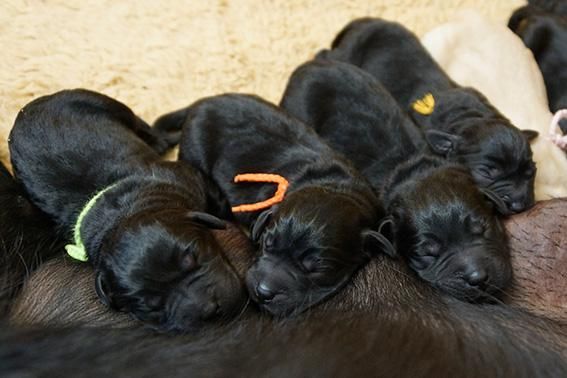 Am Sonntag, den 4. Oktober 2015 hat Rosa 9 Welpen zur Welt gebracht. Es sind 3 Rüden und 6 Hündinnen. Je 1 Rüde und eine Hündin sind gelb und 2 Rüden und 5 Hündinnen sind schwarz. Sie wiegen bei Geburt zwischen 370 und 500 Gramm. Rosa ist eine sehr fürsorglche und erfahrene Mutter und umsorgt die Kleinen seit Geburt bestens.