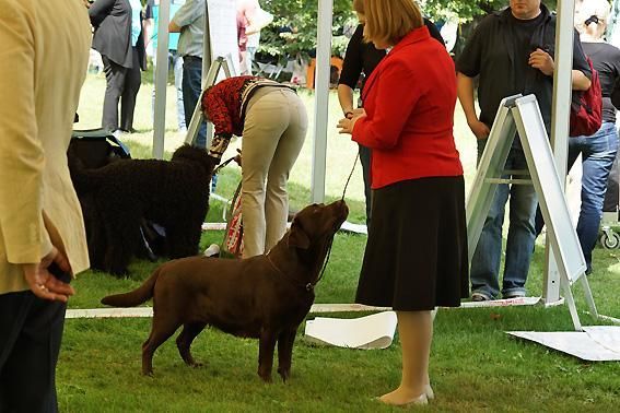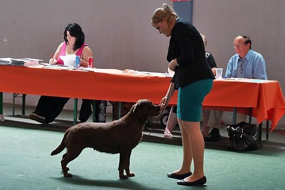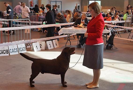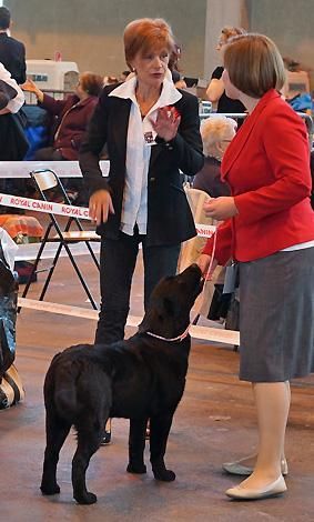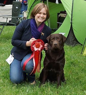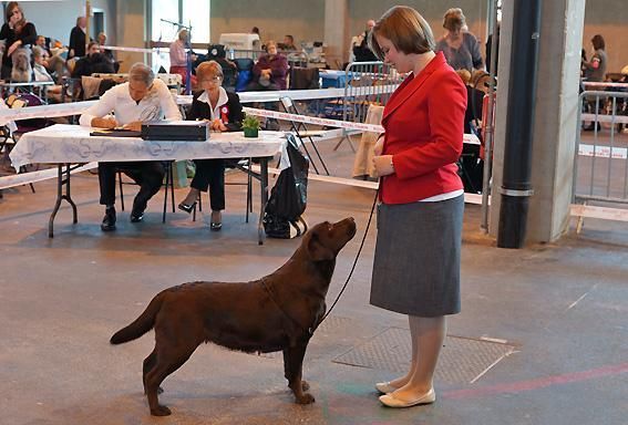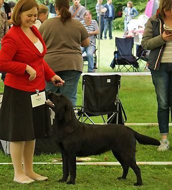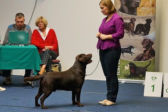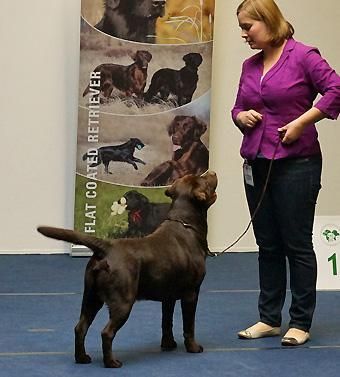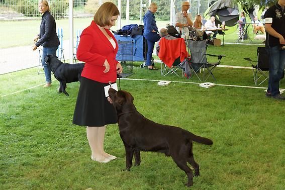 Very smart choc of excellent dark colour. Maskuline yet kind head, super neck and shoulder placement, deep through the briskett and body. Compact, strong top-line, powerful hind quarters. Movement with style and purpose round the ring. Displaces class and great breed type. A very typical Labrador.