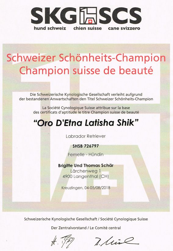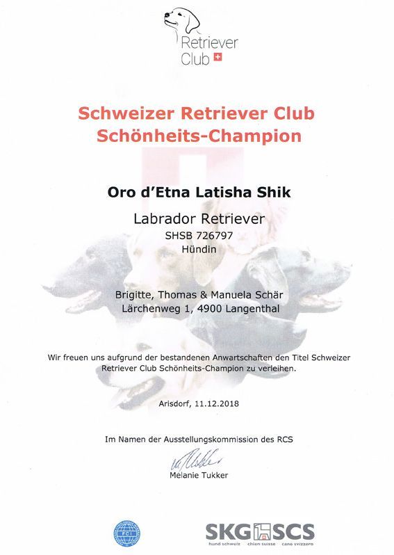 Mit dem Schweizer Retriever Club Champion erhält Latisha in diesem Jahr bereits den dritten Championtitel.