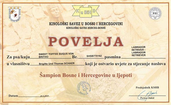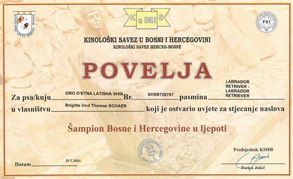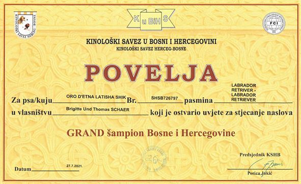Damit erhält sie folgende Titel: BiH Fed. Champion, BiH Champion und BiH Grand Champion