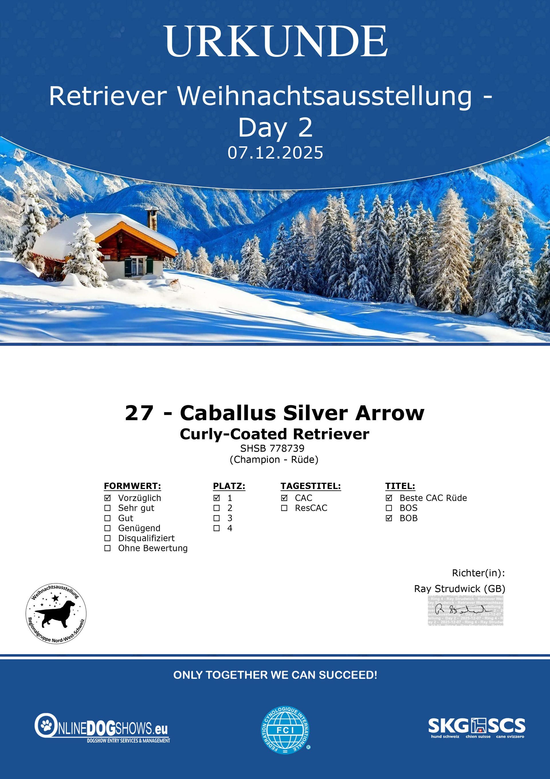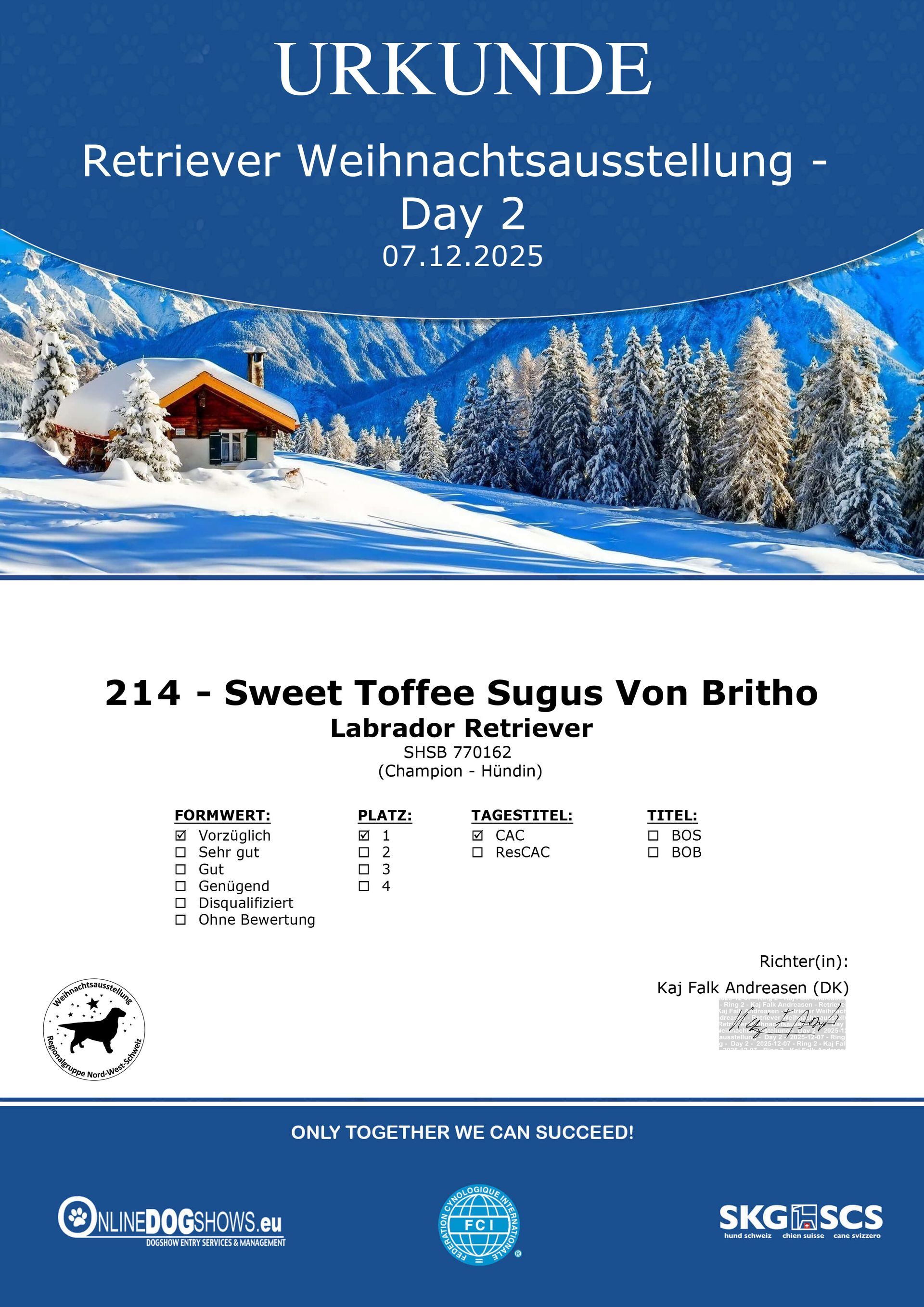 Sam erhält mit vorzüglich 1 das CAC und wir Rassenbester BOB