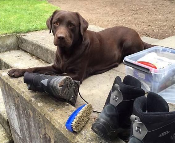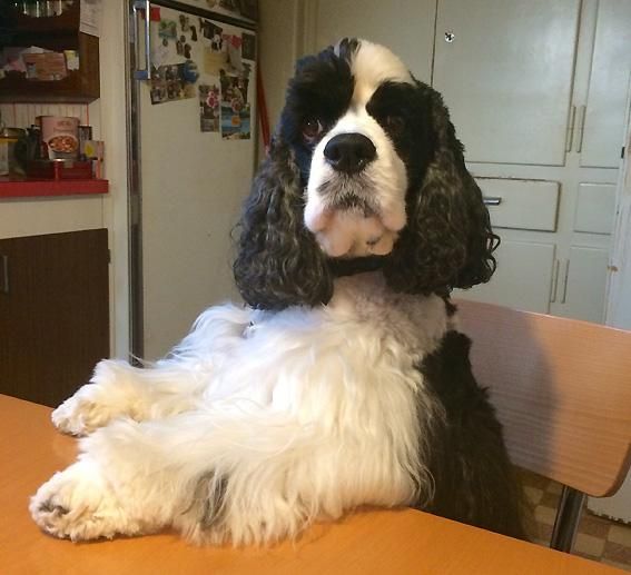 oben, unser Gast Justin sitzt am Tisch, unten, Ella hilft beim Schuheputzen