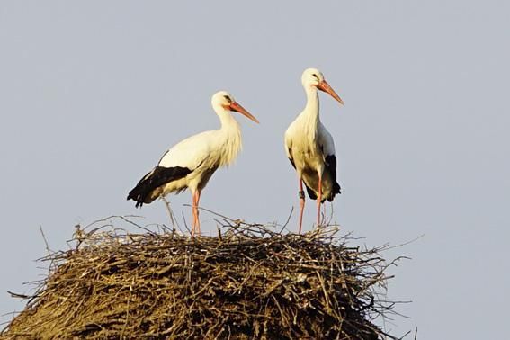 Das Storchenpaar baut auf dem Schulhaus in Roggwil weiter an ihrem Nest
