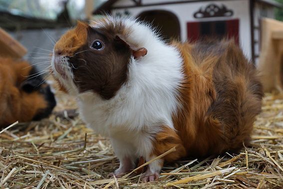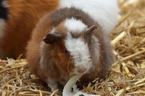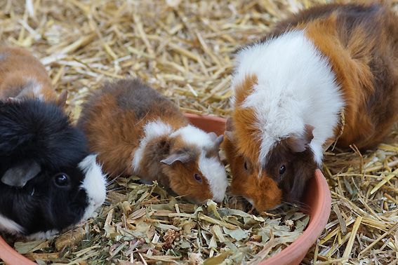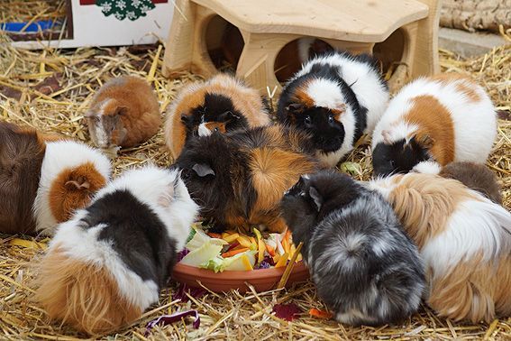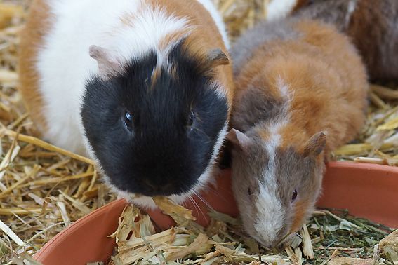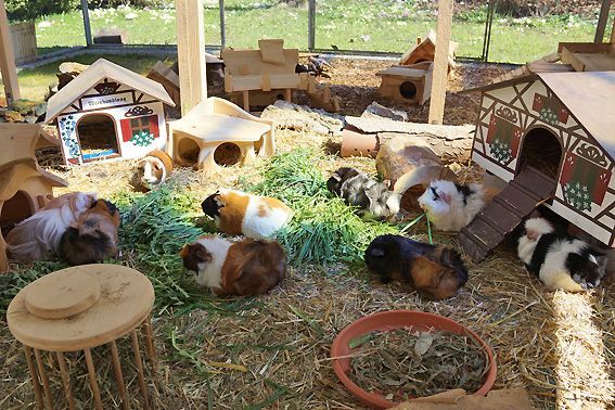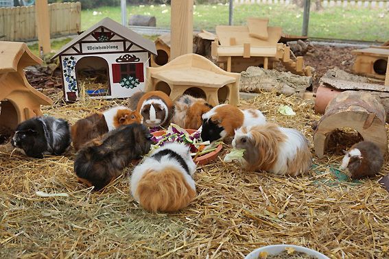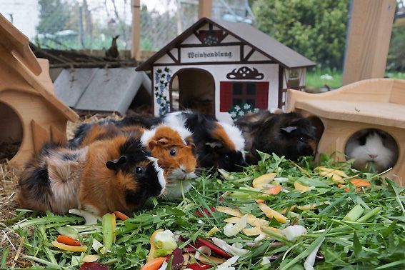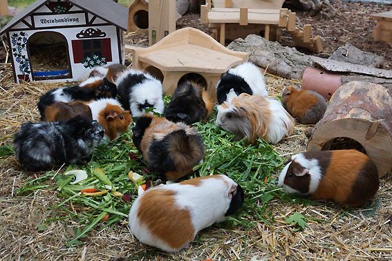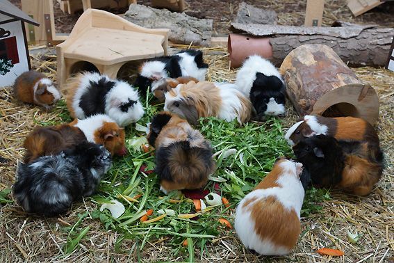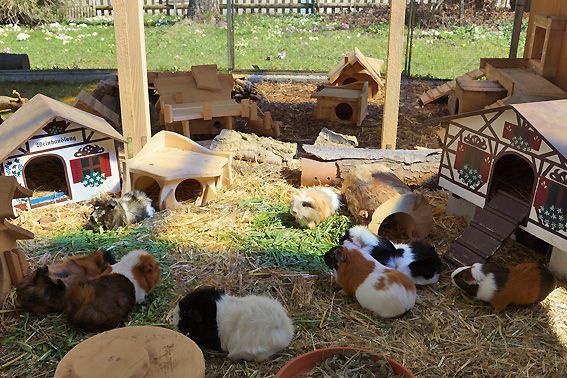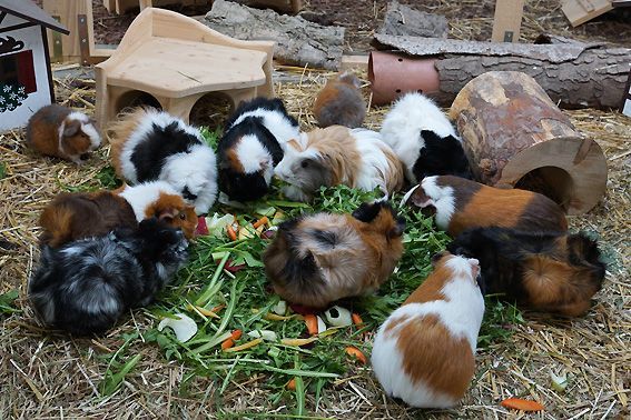 In der Zwischenzeit leben 12 bunte Meerschweinchen in unserem Gehege. Es sind 10 Weibchen und 2 kastrierte Böcke. Alle vertragen sich sehr gut, beim Fressen ist aber schon eine klare Rangordnung erkennbar. Die 2 jüngsten, die am 30. März bei uns eingezogen sind, wurden durch die Gruppe herzlich begrüsst und bestens aufgenommen.